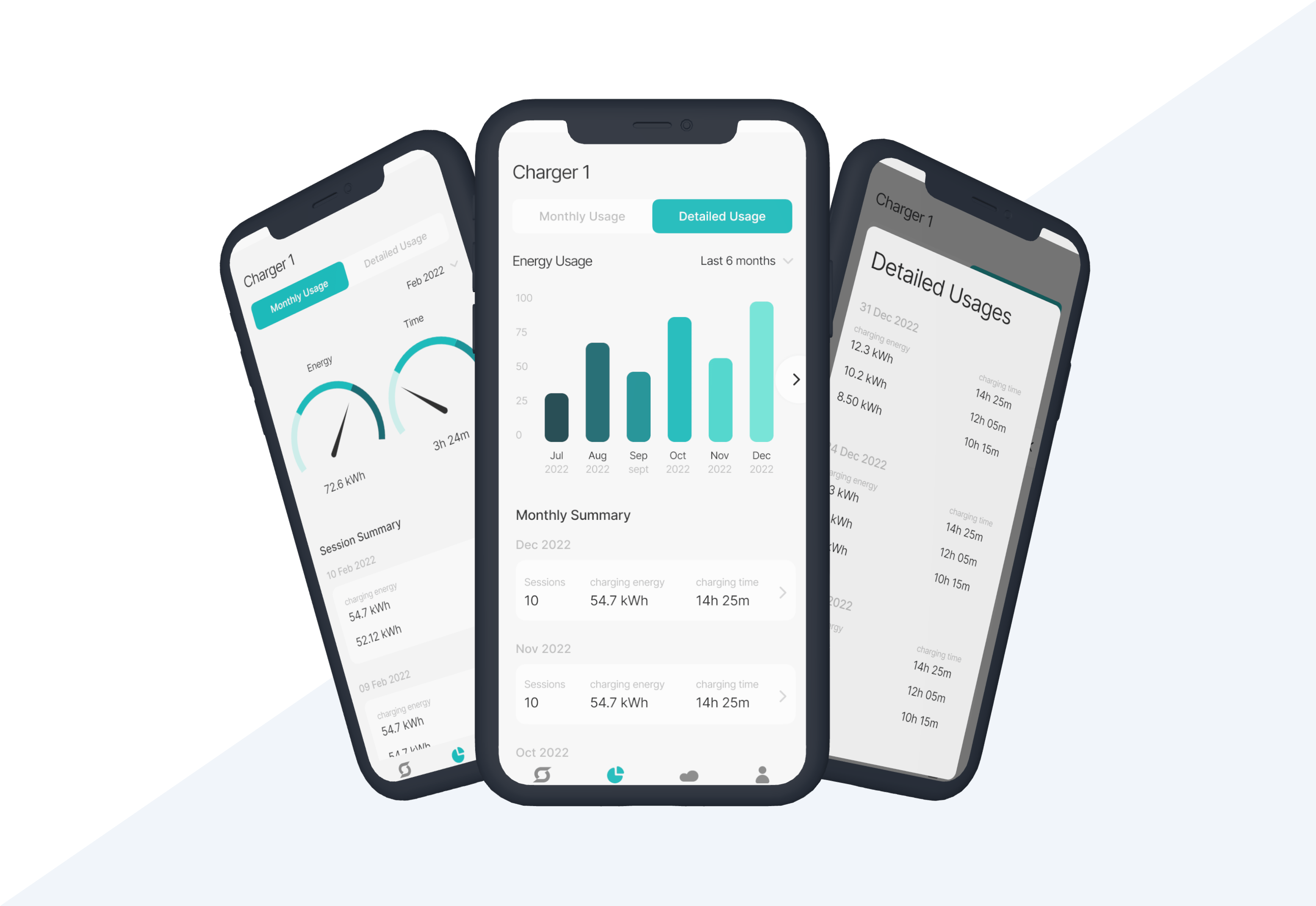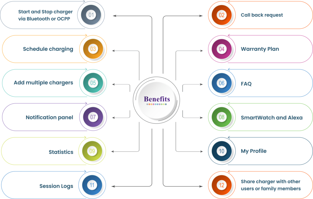 Charge your EV through Bluetooth and Wi-Fi service, plug in and start charging immediately, schedule charging at a later time, set detailed schedules to take advantage of lower electricity rates, manage your charging progress, share access to your charger with friends and family, track your charging consumption statistics, review, renew extend your warranty, service package and customer support from the application.